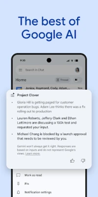 Iedomājieties sadarbību, kas ir tik gudra, ka teju lasa jūsu domas. Ar **Chat** un jaudīgo **Gemini** mākslīgā intelekta integrāciju jūsu komanda sasniegs jaunu produktivitātes līmeni. Aizmirstiet par apjomīgu informācijas šķirošanu – **Chat** gudri apkopo sarunas, piedāvā tūlītēju tulkojumu vairāk nekā 120 valodās un nodrošina zibenīgu, ar MI darbinātu meklēšanu, lai atrastu tieši to, kas nepieciešams. Izsekojiet svarīgākajiem uzdevumiem un darbību vienumiem bez piepūles, nodrošinot, ka visa komanda vienmēr ir informēta un saskaņota.