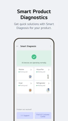 LG ThinQ ir arī jūsu visaptverošais atbalsta partneris. Risiniet problēmas un iesniedziet pakalpojumu pieprasījumus tieši no lietotnes. Izmantojiet viedo diagnostikas funkciju, lai ātri pārbaudītu produkta statusu, vai pasūtiet profesionāla inženiera apmeklējumu precīzai diagnostikai un pārbaudei. Jums vairs nav jāmeklē atbildes citur – vienkārši pajautājiet mūsu AI darbinātajam "Chat with LG" par jebkuru ThinQ sadzīves tehniku. Saņemiet atbildes, kas pielāgotas tieši jūsu produkta situācijai un stāvoklim, nodrošinot ātru un efektīvu risinājumu. Lūdzu, ņemiet vērā, ka piedāvātie pakalpojumi un funkcijas var atšķirties atkarībā no jūsu produkta modeļa un reģiona.
