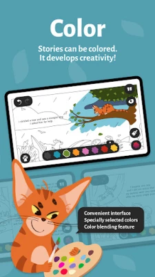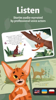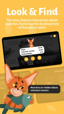 Ar šīs interaktīvās grāmatas palīdzību bērni var apgūt jaunas prasmes bez piepūles. Tā piedāvā aizraujošu vārdu apguvi trīs valodās – ukraiņu, poļu un angļu – ar profesionāliem balss ierakstiem. Mazie pētnieki var ienirt pasaku pasaulē, piemēram, kopā ar iedomīgo kaķi Rūdolfu, lai izprastu apkārtējo vidi. Lietotne veicina krāsu izjūtas attīstību, ļaujot bērniem pašiem krāsot ilustrācijas un iejusties mākslinieku lomā. Interaktīva priekšmetu meklēšana stāstos uzlabo telpisko orientāciju, smalko motoriku un domāšanu, savukārt iespēja klausīties tekstu vai lasīt pašam palīdz apgūt lasītprasmi. Katra atrastā priekšmeta reģistrēšana turklāt sniedz pārskatu par bērna progresu un sasniegumiem.