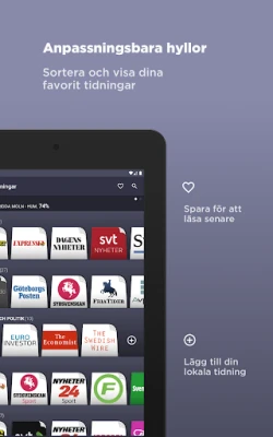 Lietotne piedāvā izcilu personalizācijas un navigācijas pieredzi. Visas publikācijas ir rūpīgi sakārtotas kategorijās, lai nodrošinātu intuitīvu pārlūkošanu. Pēc dienas ziņu lasīšanas jūs varat acumirklī pārslēgties uz citiem attiecīgās kategorijas izdevumiem, piemēram, salīdzinot *Svenska Dagbladet* vai *Aftonbladet* ziņu analīzi. Jūsu lasīšanas komfortam pieejams tumšais režīms (DARK MODE), kas samazina acu slodzi. Pielāgojiet savu virtuālo plauktu saturu un avīžu secību, vienkārši velkot un nometot elementus. Turklāt jums ir iespēja pievienot žurnālus vēlmju sarakstam, kā arī atzīmēt interesantus rakstus kā favorītus, lai atgrieztos pie tiem sev ērtā laikā. Ja nepieciešams, jebkuru publikāciju var atvērt arī ārējā interneta pārlūkprogrammā.